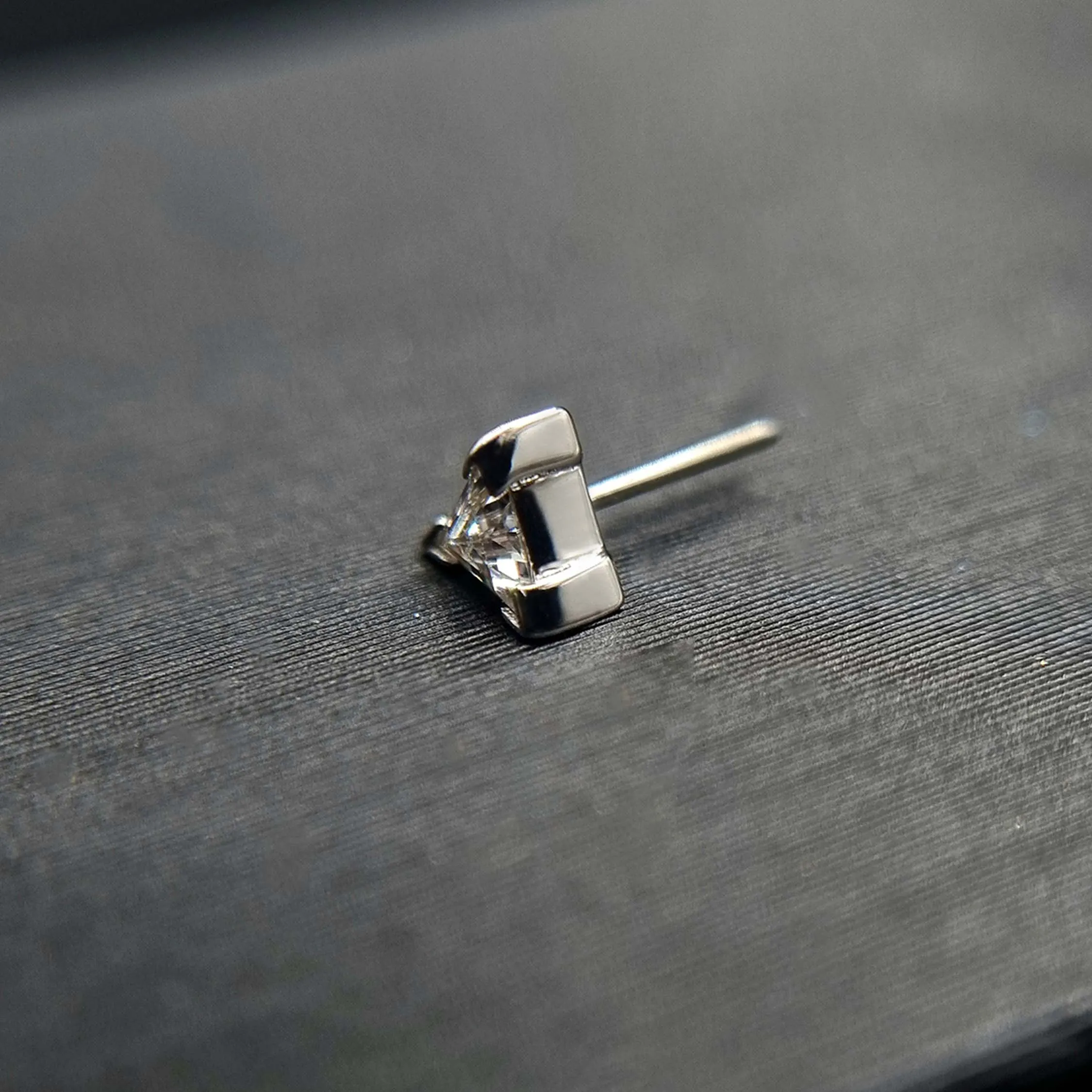 Trokutasti chevron u bijelo zlato elegantna je, ali moderna ponuda tvrtke Shanga Jewellery, dizajnirana za piercere koji žele svojim klijentima pružiti prekrasne opcije. Izrađena od 18-karatnog bijelog zlata, ova pribadača bez navoja pričvršćuje se na labret stupiće od 16G ili 14G. Dostupan u dvije veličine (veliki: 3,3 mm x 3,8 mm; mali: 2,4 mm x 2,7 mm), ovaj vrh ima svjetlucave kubne cirkone u modernom trokutastom chevron uzorku. Dizajn pruža moderan osjećaj svakom piercingu hrskavice, tragusa, školjke ili spirale.