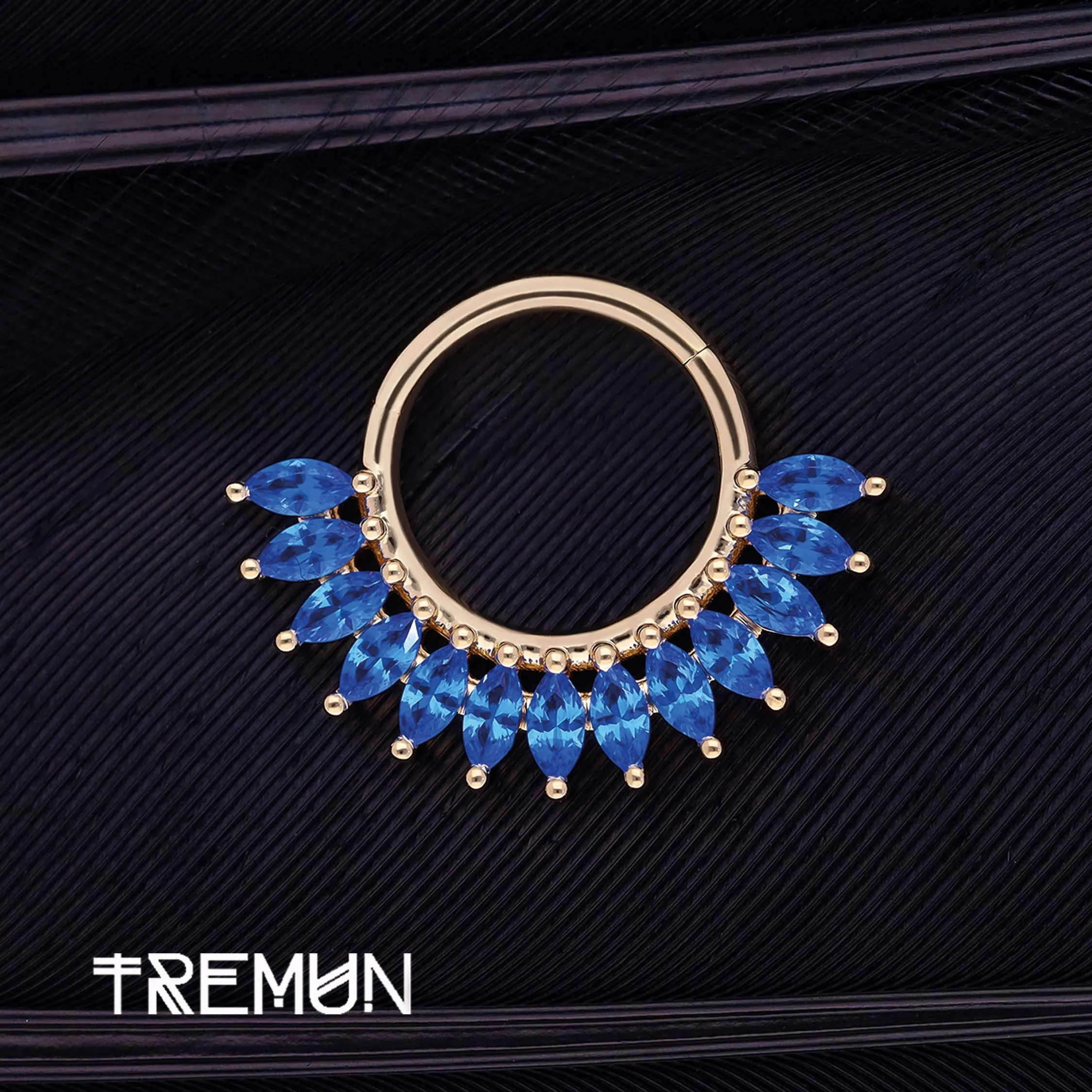 L'anello a scatto Laboratory Sapphire Maria in oro giallo รจ pensato per gli studi e i negozi che apprezzano i gioielli con pietre preziose di alta qualitร . L'anello a scatto 16G in oro giallo massiccio 14 carati ha un diametro di 8 mm, che lo rende abbastanza versatile da poter essere indossato in una varietร di piercing, come il setto, il daith e la cartilagine. La fila di zaffiri coltivati in laboratorio conferisce al gioiello uno splendido colore blu, aggiungendo al design sia l'estetica che la provenienza etica.