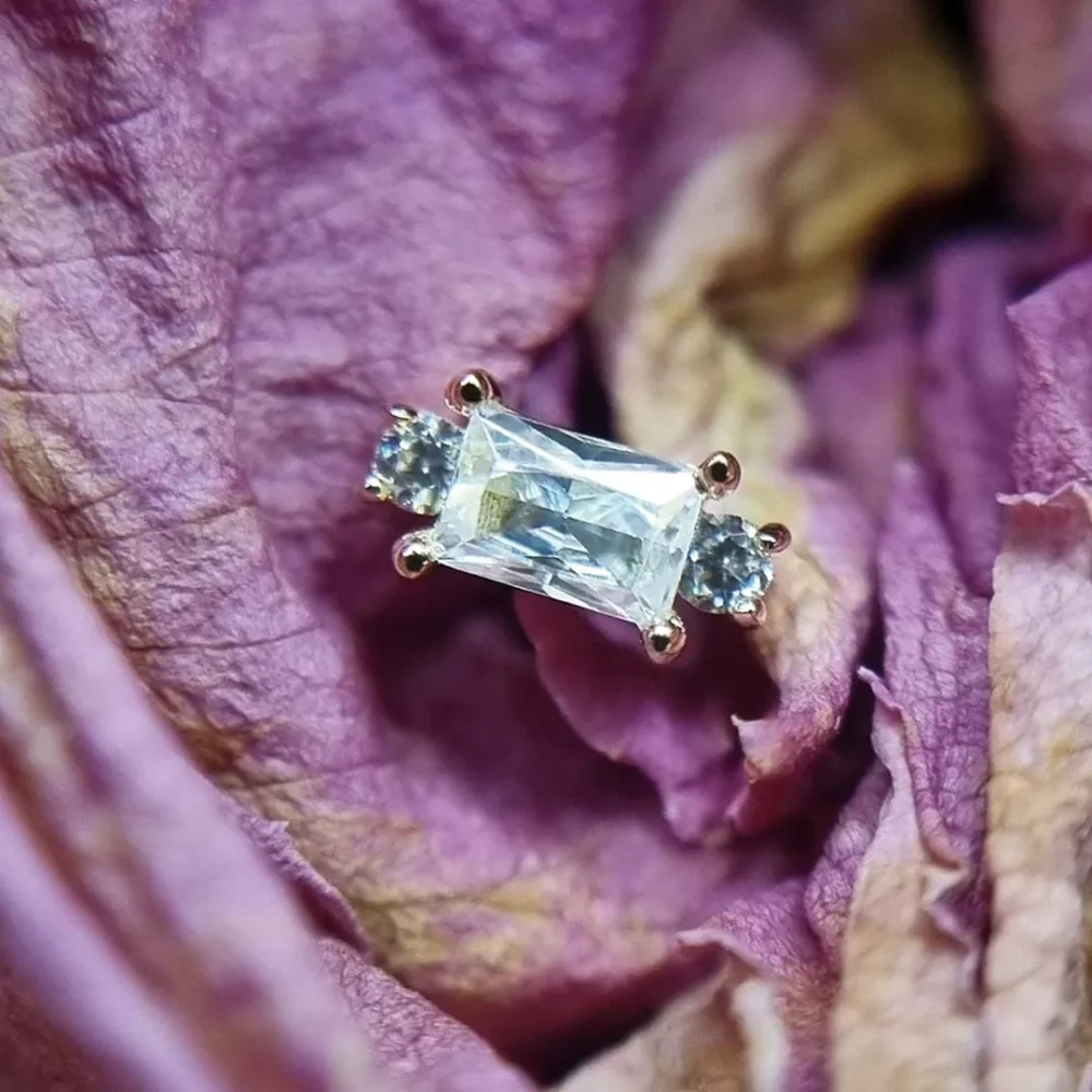 Shanga Jewelry's Baguette Double Point is een stijlvolle, draadloze juwelen top ontworpen voor uw piercer of de piercer van uw klant! De 18k geelgouden top is een push-pin stijl top van 2,9 mm x 5,5 mm en is voorzien van een prachtige zirkonia baguette steen gezet in een dubbele punt. De nauwkeurigheid van het moderne ontwerp zal elke piercing verheffen dankzij de scherpe stijl.