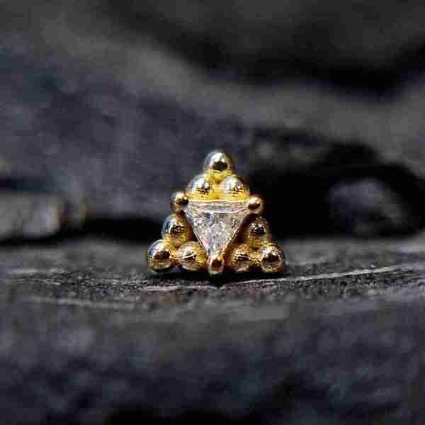Triangle Alisea 3, oferowany przez Shanga Jewellery, to wyrafinowana i delikatna biżuteria do ciała, która łączy minimalizm z luksusem. Wykonany z wysokiej jakości 18-karatowego żółtego złota, zastosowanie bezgwintowego topu zapewnia zarówno bezpieczeństwo, jak i trwałość połysku; idealny do użytku w profesjonalnym studiu piercingu. Ta nowoczesna biżuteria ma wymiary 3,8 mm x 4,1 mm i zawiera jasne cyrkonie w tych minimalistycznych kształtach, które zapewniają subtelny, ale efektowny blask. Dzięki czystemu, trójkątnemu kształtowi ten nowoczesny element jest idealny do noszenia w wielu kolczykach, takich jak nozdrza, tragus, spirala lub płatek.