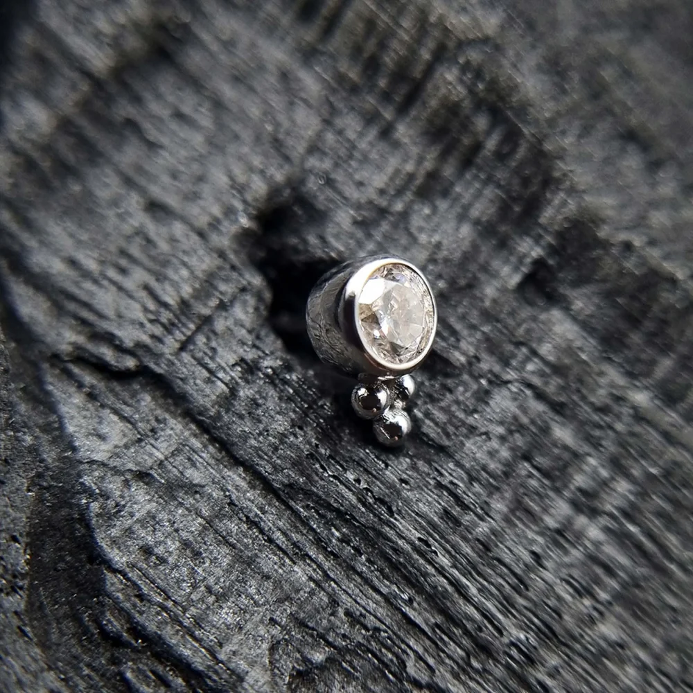 The Alisea 1 White Gold push pin top is a great addition to any piercing professional’s inventory. Made of high-quality 18k white gold with a cubic zirconia accent, this top offers a combination of luxury and practicality. This gem is compatible with 16G and 14G threadless labret posts, allowing for secure wear and easy placement by professional piercers. The Alisea 1 top is available in both big and small sizes, which means it will fit many piercings, including helix, tragus, lobe, conch, and more.