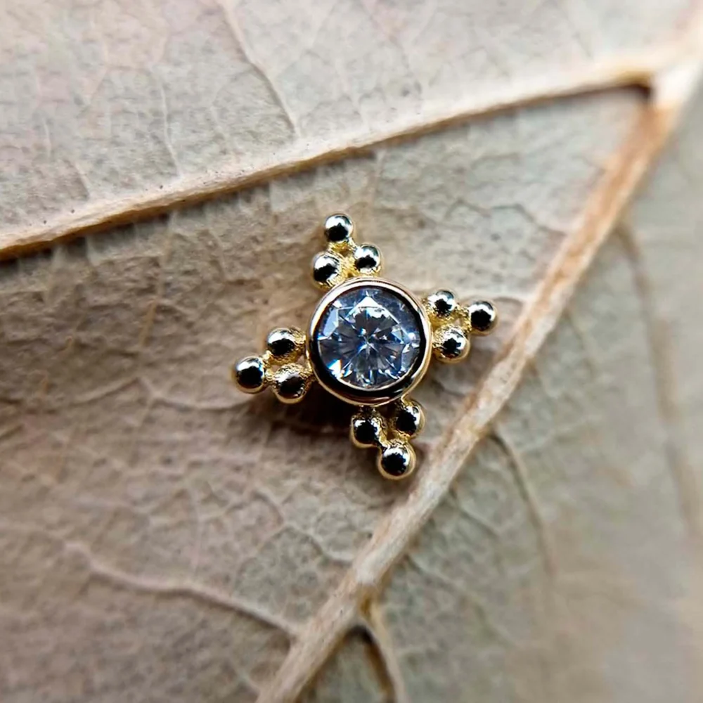 The Alisea 4 in Yellow Gold by Shanga Jewellery is both stunning and elegant, giving you the perfect combination of sparkle and sophistication. Crafted from 18k yellow gold and set with high-quality cubic zirconia, it is the luxurious choice for any piercing. This piece fits both 16G and 14G threadless labret posts and is a studio staple for flat, helix and lobe piercings.