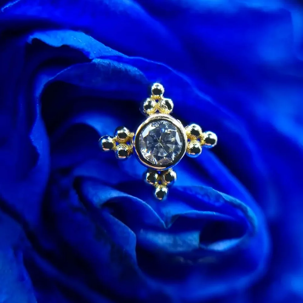 The cluster of four stones forms a symmetrical floral design, which shines and sparkles beautifully when hit by light; it’s great for clients who want class and a hint of dazzle. The threadless push-pin system provides a comfortable and secure fit, and it is easy for professionals to install. A unique piece for retailers making exclusive fine gold and diamond collections.