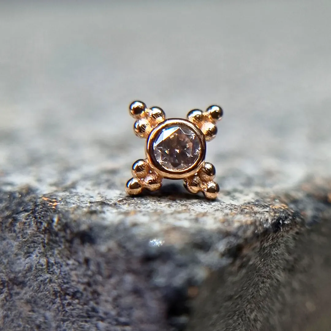The cluster of four stones forms a symmetrical floral design, which shines and sparkles beautifully when hit by light; it’s great for clients who want class and a hint of dazzle. The threadless push-pin system provides a comfortable and secure fit, and it is easy for professionals to install. A unique piece for retailers making exclusive fine gold and diamond collections.