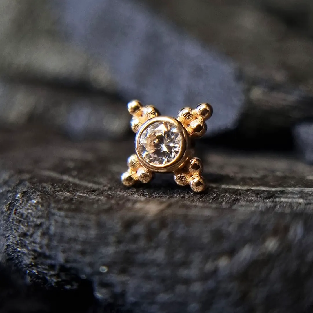 The Alisea 4 in Yellow Gold by Shanga Jewellery is both stunning and elegant, giving you the perfect combination of sparkle and sophistication. Crafted from 18k yellow gold and set with high-quality cubic zirconia, it is the luxurious choice for any piercing. This piece fits both 16G and 14G threadless labret posts and is a studio staple for flat, helix and lobe piercings.