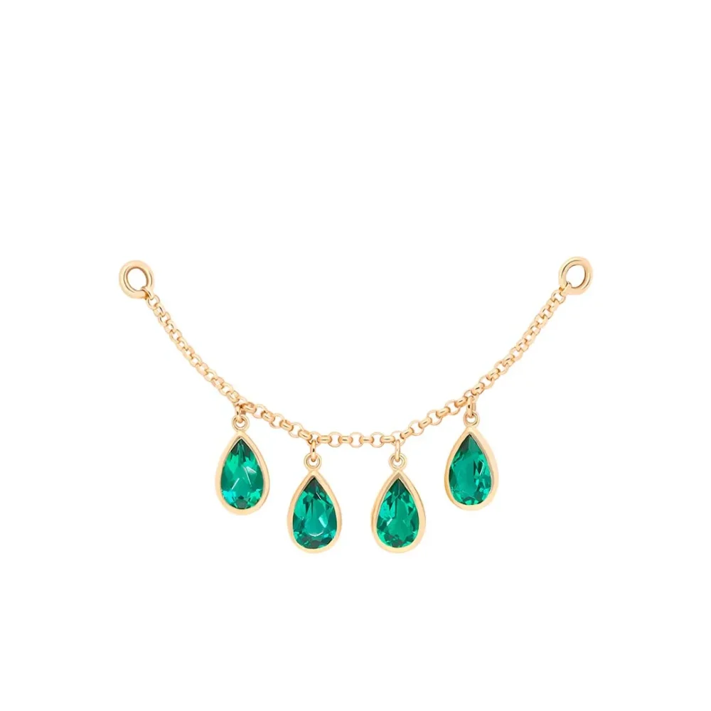 The Rennie chain accessory shines with four lab-created emerald drops with gleaming 14k yellow gold. This graceful connector chain was created with dual piercings in mind, allowing for moving and shining active beauty when worn in lobe, helix, or flat arrangements. The lab emeralds offer a wonderful pop of green to complete curated ear styling and elevated piercing beauty!