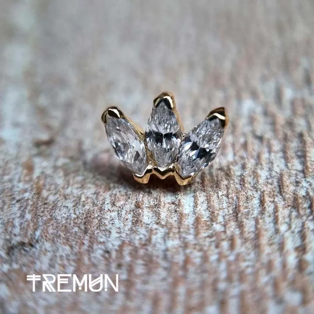 A extremidade sem fio Marquise 3 é uma peça de afirmação geométrica que é simultaneamente arrojada e sofisticada. Feita em luxuoso ouro amarelo de 14 quilates, foi concebida em torno de um Swarovski CZ de corte marquise que é elegantemente rodeado por três cristais redondos brilhantes, alargados numa posição triangular, proporcionando movimento e interesse visual. Com destaque visual, pode confiar que é bem construído com uma base roscada interna.